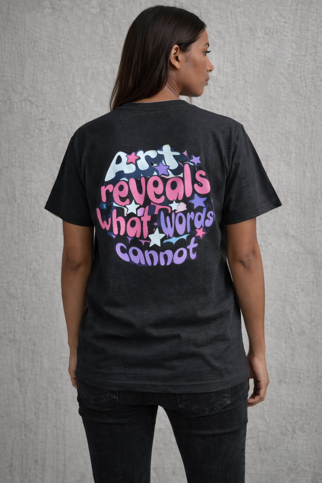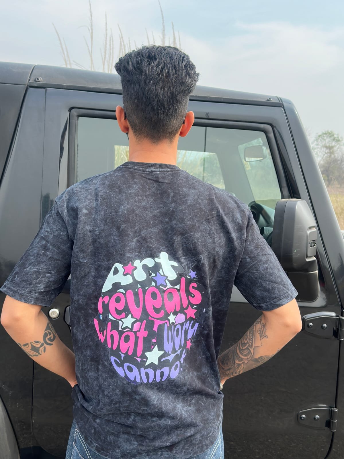More than just a clothing item, this acid black tee is a form of self-expression. The impactful phrase ‘Art Reveals What Words Can’t’ serves as a reminder of the power of creativity and emotion beyond spoken language. Whether you’re an art enthusiast or someone who appreciates thought-provoking elements in fashion, this tee will resonate with your values. Pair it with jeans for a casual chic look or layer it under a blazer for an edgy contemporary style.